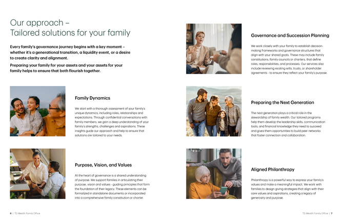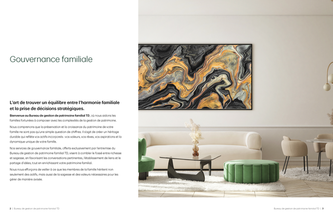 Family Office is TD Wealth's ultra high-net worth segment and caters to an affluent clientele. As part of developing the overall look and feel for the Family Office team, subsequent collateral were created to equip advisors with the knowledge they require to serve their clients' everyday unique needs. The brochure was also created in French to align with Canada's Bill 96 and meets accessibility/AODA standards