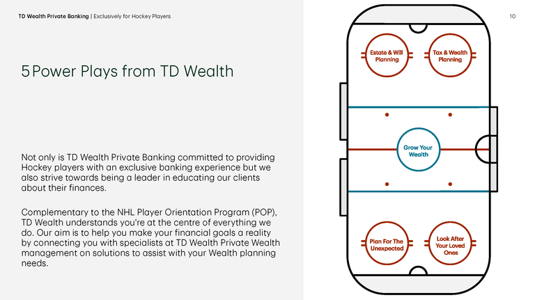 Private Banking is TD Wealth's exclusive segment and caters to an affluent audience. This brochure was strategically created to pitch to professional NHL hockey players to sign up to Private Banking's unique offerings. Hockey themed infographics were sprinkled throughout the layout to show intentionality to the audience, while also meeting accessibility/AODA standards.